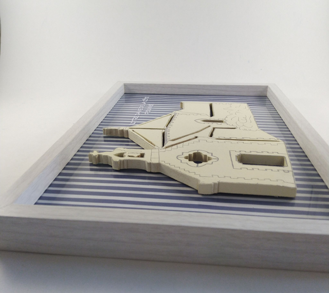 Découpe artisanale faite à la scie à chantourner en médium, peinte à la main puis collée sur le verre.