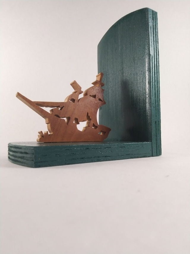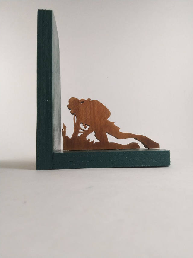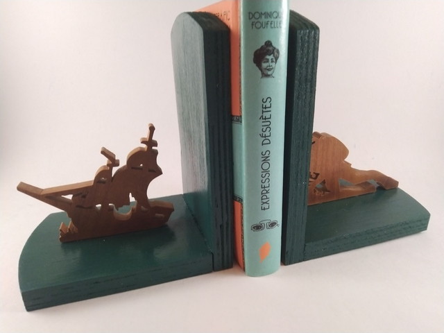 Un beau duo de serre-livre en contre-plaqué de peuplier peint dans un joli vert foncé, découpes des silhouettes de l'épave et du plongeur en bois massif vernis.